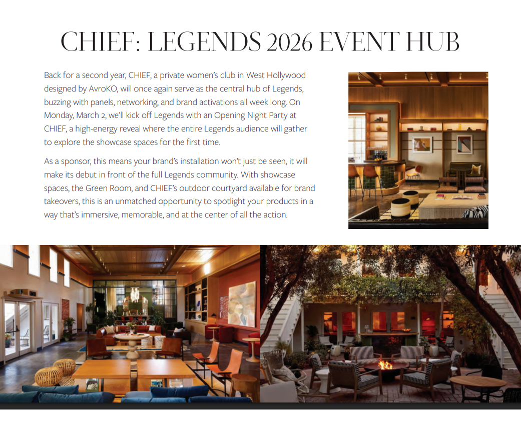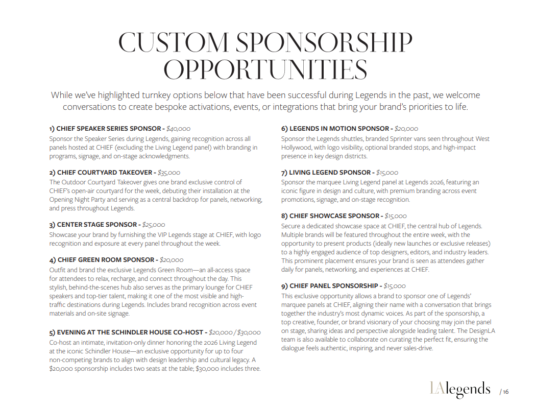 Design LA welcomes both endemic and non-endemic sponsors. Legends has a proven track record of partnership with travel, lifestyle, and financial-services brands seeking meaningful connection with design-conscious cultural leaders.
